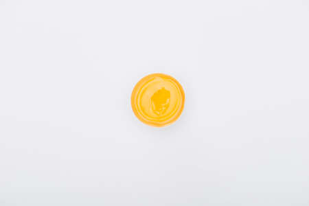 top view of fresh chicken egg with yolk isolated on white