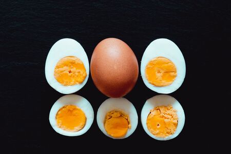 Hardboiled egg halves with one whole egg on black background – Fresh and organic morning food – Natural and full of proteins ingredient in a keto diet