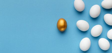Stand out from the crowd. One unique golden egg standing opposite of identical ones. Courage, confidence, success, crowd and creativity concept.
