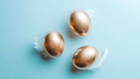 Easter eggs on blue background. Three golden eggs. Minimal style. Easter decorations. Happy Easter.