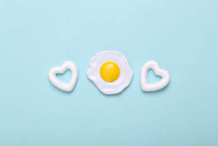 Plastic scrambled eggs with hearts on blue background