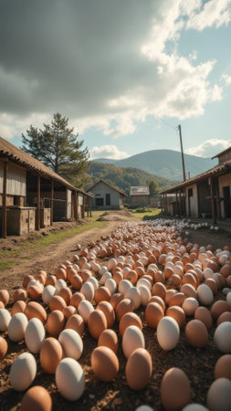 Hundreds of eggs sun-drying on farm pathway amidst rustic barns and mountains. That the image is generated using AI.