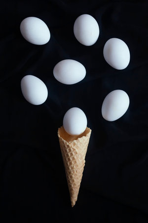 White eggs over ice cream cone. Easter eggs and ice cream cone waffle on dark background