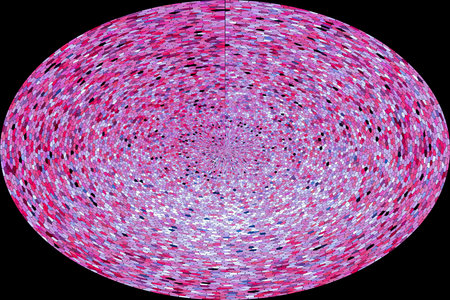 Abstract micrograph of multicolor moss leaves in digitally altered, oval vignette resembling an egg, at 40x.