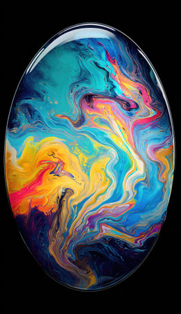 Gasoline blur fluid. Mystical paint. Colorful emulsion oil dye mix glow sphere. Red green cosmic background black space whirl frame.