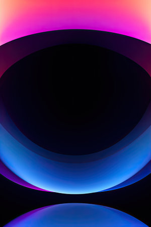 Soap bubble. Neon arch. Colorful round lens paint mix light flow on black background. Purple blue green night defocused abstract overlay.