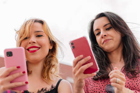 Bottom view of two young adult women using their mobile phone. Connectivity, social media, smartphone and lifestyle concept
