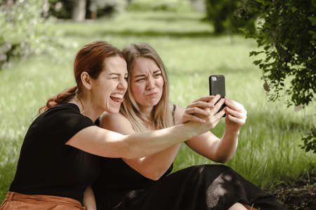 Two woman having fun on picnic. Friends on blanket communicating happily making selfie. Cheerfully female talk outdoors, People laughing and having rest in garden, park with smartphone