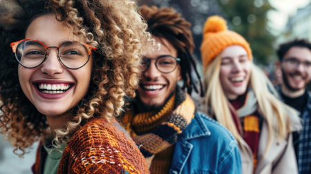 Diverse group of friends smiling together outdoors, dressed in cozy winter attire, capturing a moment of joy and connection in a lively and cheerful setting