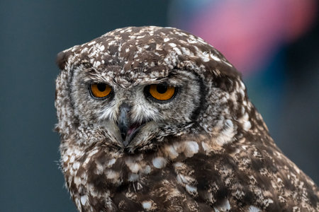 Eurasian eagle-owl (Bubo bubo), head close-up. Natural environment. Portrait art. Wildlife, nature, birds, ornithology, biology, zoology, science, education, graphic resources