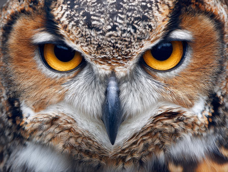 A commanding owl stars intently, its luminous yellow gaze piercing through the darkness. Fine feathers reveal intricate patterns, embodying fierce nocturnal prowess.