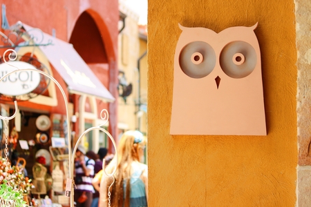 Riga, Latvia - April 5, 2020: Head of bronze owl sculpture at the Old Town's Doma Square playground, designed by sculptor Liene Mackus.