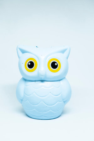 A close-up toy of a surprised blue owl with multi-colored eyes stands on a piece of wood in the light of the evening sun. The photo was taken in front of the sun