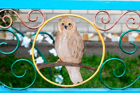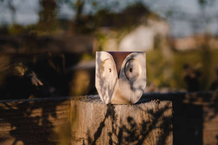 a small wooden toy owl with big eyes sits on a wooden fence. eco toys concept