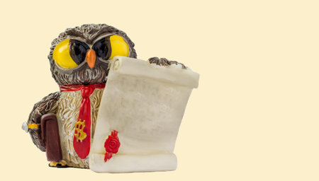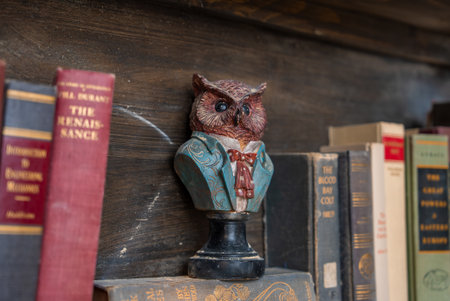 Close Up of Decorative Owl Figurine in Suit on Wooden Shelf with Books