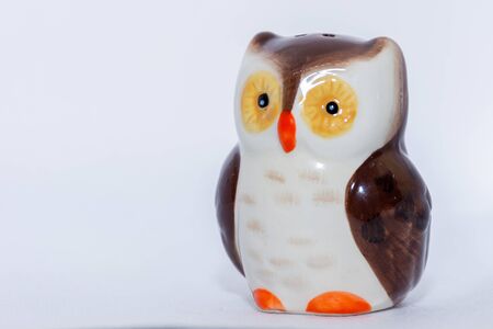 Bright orange, brown and yellow festive owl salt and pepper shaker ornament on an isolated white background for fall thanksgiving and halloween season.