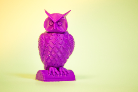 One object of purple color printed 3d printer is stands on yellow table on background of gray blue brick wall close-up. Concept progressive modern additive technology for 3d printing.