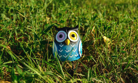 A toy of a surprised blue-colored owl with multi-colored eyes close-up stands in the middle of green grass in the light of the evening sun