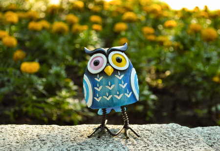 A toy of a surprised blue-colored owl with multi-colored eyes close-up stands on a stone against a background of yellow flowers in bokeh