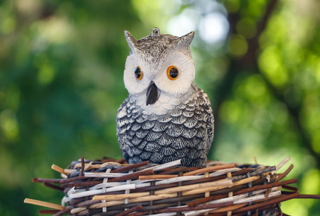 A small owl figurine is sitting on a nest made of twigs. The owl is looking up at the camera, and the nest is surrounded by green leaves. Concept of calm and peacefulness