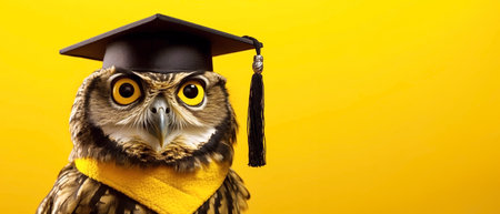 Owl with graduation cap and yellow background, study concept, panoramic layout. Generative Ai