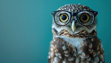 Closeup of an owl wearing glasses, teal background, sharp focus on eyes
