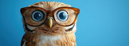 An owl is the focal point of this image, adorned with eyeglasses and a plaid shirt. Its feathers exhibit various shades of brown and white. The composition features a blue backdrop, accentuating the owl's details. This image could be suitable for educational materials or creative projects.