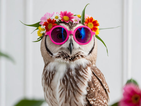 AI Generated. Owl with Pink Round Sunglasses Wearing Flowers and Leaves