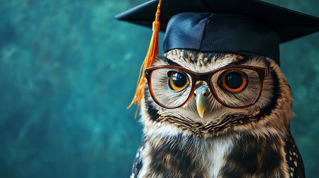 A wise owl, adorned with a graduation cap and tassel, intently reads an open, aged book. The scene is set against a solid teal backdrop, highlighting the owl's intelligence and scholarly pursuit.