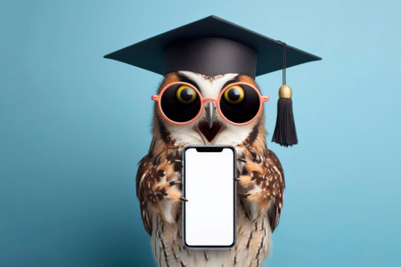 Shocked Owl with graduation hat in sunglasses holding smartphone with white mockup screen. ai generative.