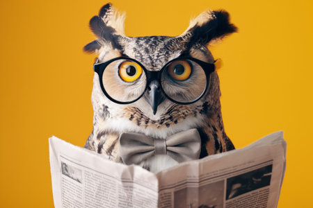 Amusing image of a majestic owl dressed as a scholar with large spectacles and bow tie, attentively perusing a newspaper