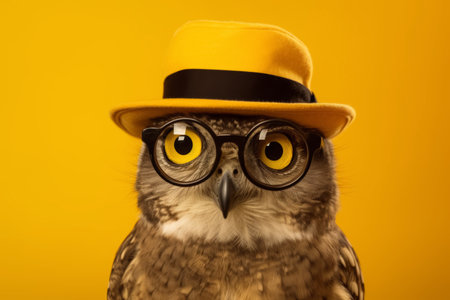 A quirky portrait of a smartly-dressed owl wearing glasses and a yellow hat against a vibrant yellow background, showcasing unique wildlife fashion
