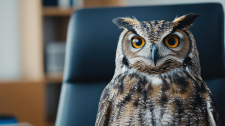 Majestic owl perched in an office chair, showcasing keen awareness.