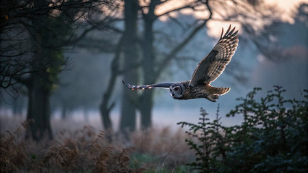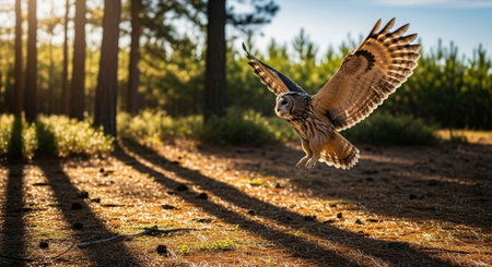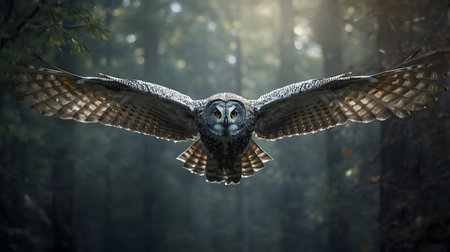 Photo showing great grey owl in flight with misty forest backdrop. Clear details and vibrant colors enhance visual appeal.