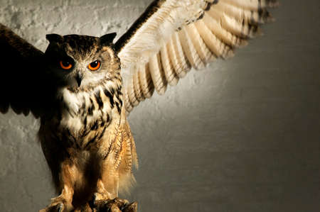A well lit studio shot of an eagle owl looking menacing with wings splayed