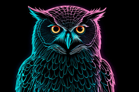 Illustration, neon aesthetics, neo-noir, X-ray image owl. Generative.