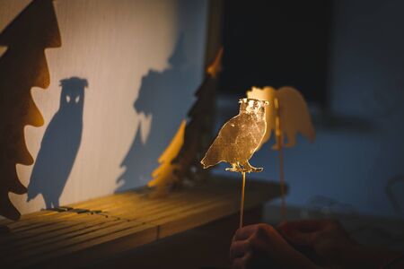 teacher do a shadow play owl in kindergarten or preschool. child play concept shadow pantomime shadowgraph for children.