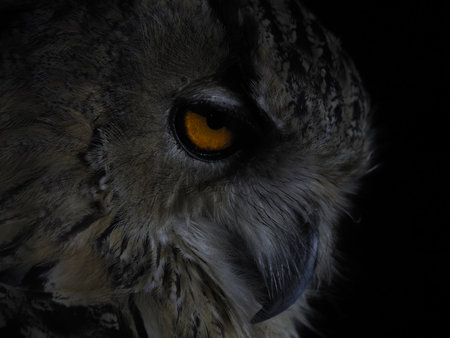 Portrait of an owl with orange eyes. Close-up.