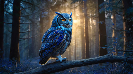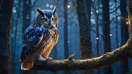 Owl sitting on a branch in the forest at night. 3d rendering