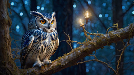 Beautiful owl sitting on a tree branch in the forest at night