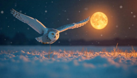 Snowy owl flying over a snow covered field at night