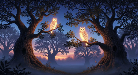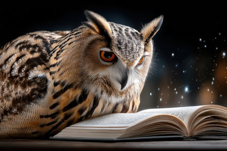 An owl rests on a book as stars twinkle in the dark sky, creating a mystical ambience.