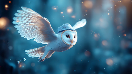 Snowy owl in a hat flying in the night sky. 3d rendering