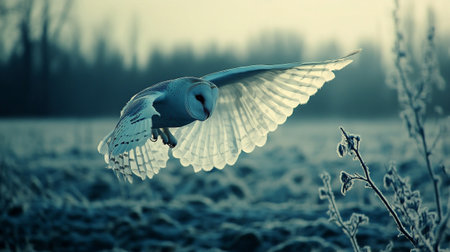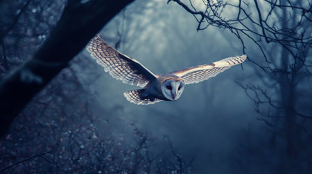Barn Owl flying in the misty forest. 3D rendering.