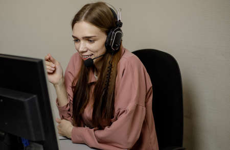 A happy call center agent working on a support hotline in the office. A call center operator is talking to a customer while looking at a computer screen in close-up. A telemarketer, a telemarketing agent, makes a conference video call, talks to an online client on a computer.