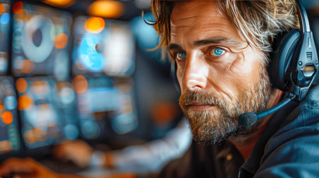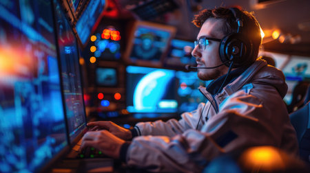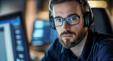 Focused man wearing glasses and headset working at a computer station in a dimly lit, high-tech office environment
