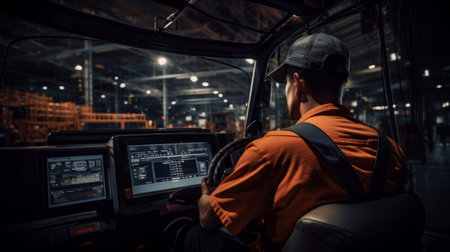 Industrial Worker Male Caucasian Middle-Aged Operating heavy machinery in a manufacturing plant, producing industrial goods in Factory. Generative AI AIG22.