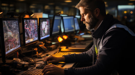 Air traffic controller focused on monitoring flight paths on multiple screens in a control tower at night.