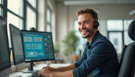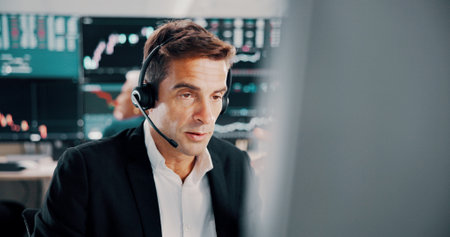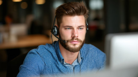Focused male customer service representative wearing headset, engaged conversation while working computer modern office environment. His expression reflects concentration and professionalism