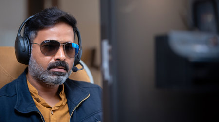 A South Asian man wearing sunglasses and headphones, focused on his computer screen.